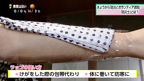 みなさんも非常持ち出し袋にはラップを入れておきましょう。