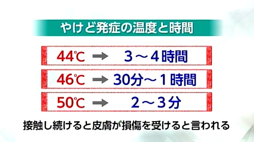 例えば44度では3~4時間、46度では30分~1時間、50度では2、3分接触し続けるとやけどを発症するといわれています。
