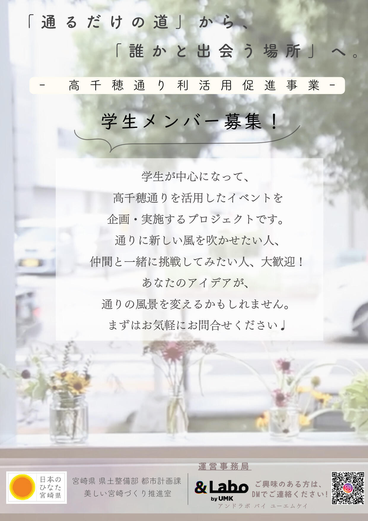 このプロジェクトは、高千穂通りの潤いと安らぎのある空間を利用して、再編整備後の高千穂通りの日常的な利活用を促進することを目的としています。学生が中心になって、高千穂通りの歩行者空間「ほこみち」でのイベントや利活用アイデアを企画・運営しています。まちづくりやイベント運営に関心のある学生の皆さんのご参加をお待ちしています。まずはお気軽にご連絡ください。お問い合わせは、&LaboインスタグラムからDMから
