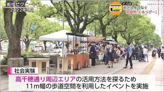 高千穂通り周辺エリアの活用方法を探るため、11m幅の歩道空間を利用したイベントを実施する社会実験を国と県と市が行ってます。その取り組みによって、 昨年末、NTT グループが「歩きたくなる道路=ウォーカブル」の再開発を決定いただきまして、宮崎市と連携協定を結びました。