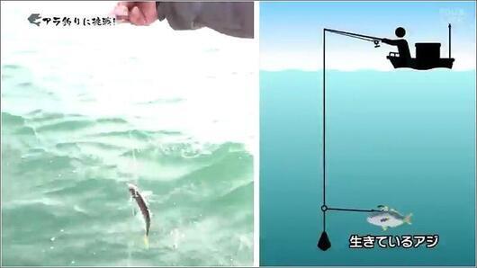 生きたアジの背中に針をつけて海の中を泳がせ、アラが食いついた瞬間にアワセて引き揚げます。