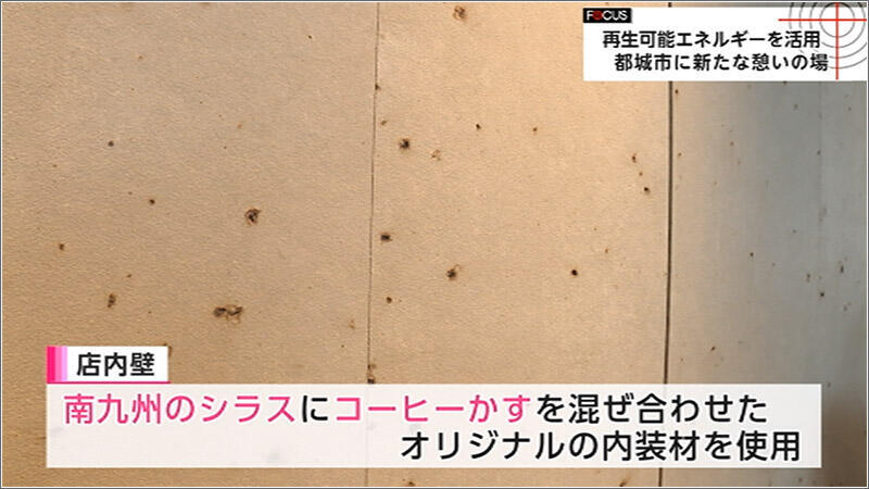 店内の壁には、南九州のシラスにコーヒーかすを混ぜ合わせたオリジナルの内装材を使用しています。