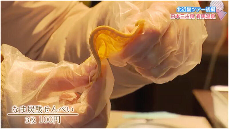 有馬温泉の炭酸成分を利用して焼き上げるなま炭酸せんべいは、焼きたての柔らかさからすぐにパリパリの食感へ変化するのが特徴です。