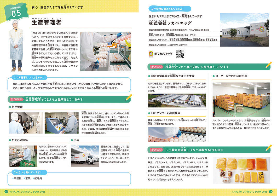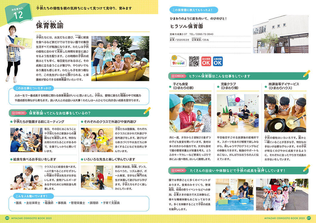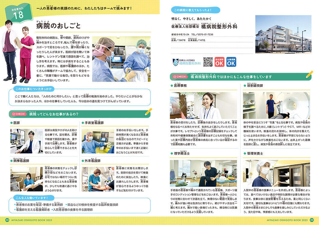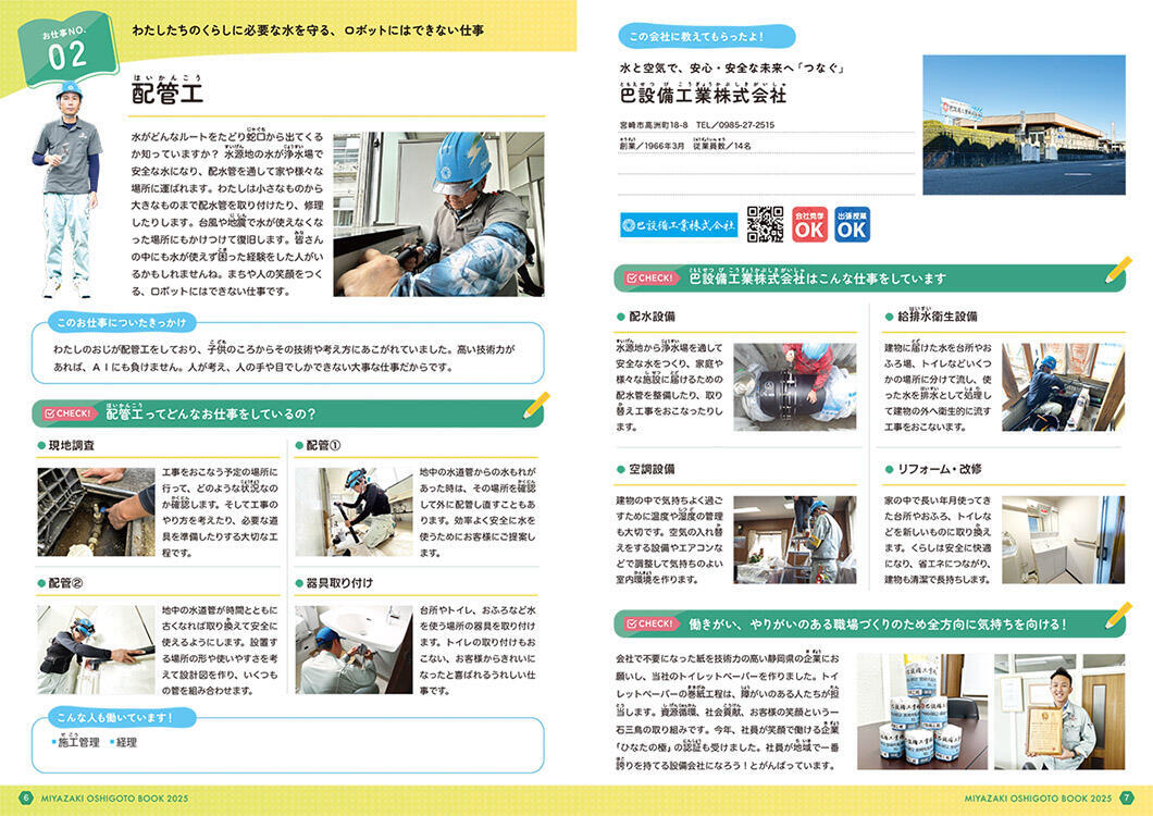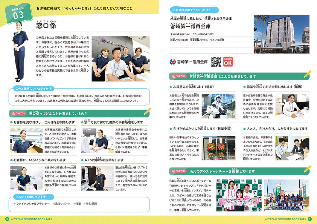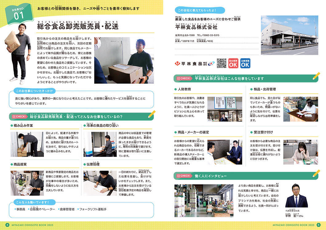この事業では、地域の未来の担い手である子供たちに向け、県内企業で活躍している様々な業種にクローズアップした「宮崎県のおしごと本」を小学5年生の副教本として配布しています。