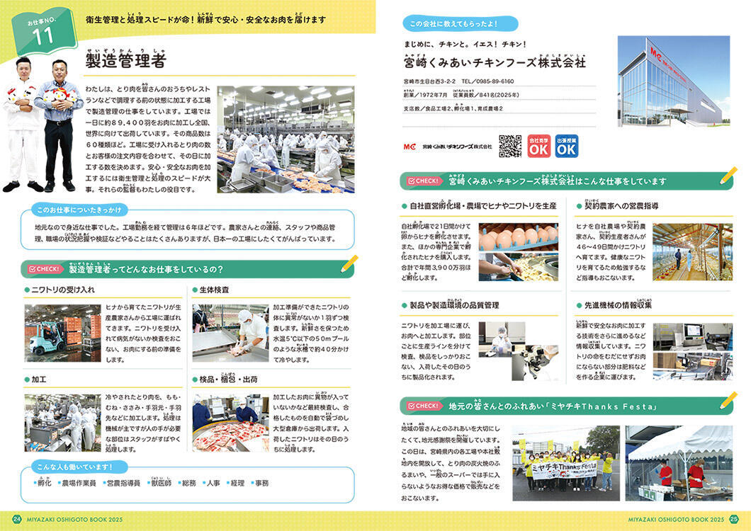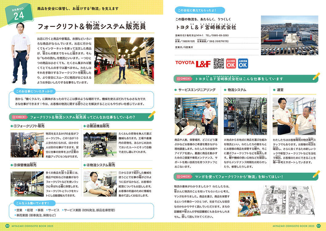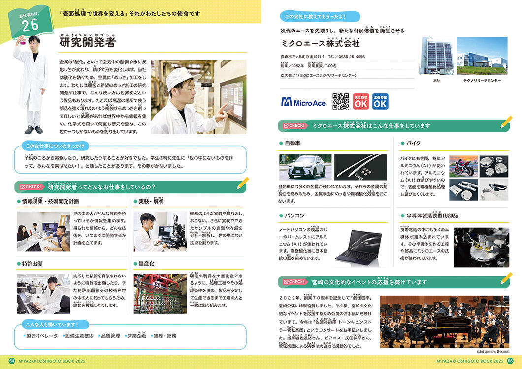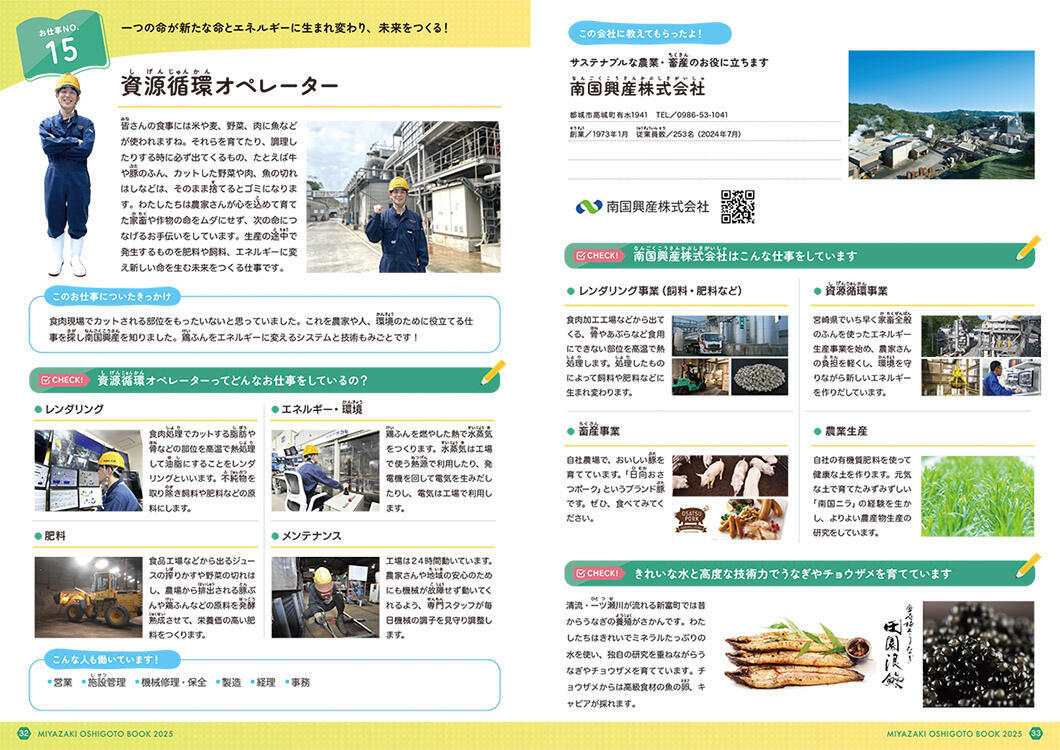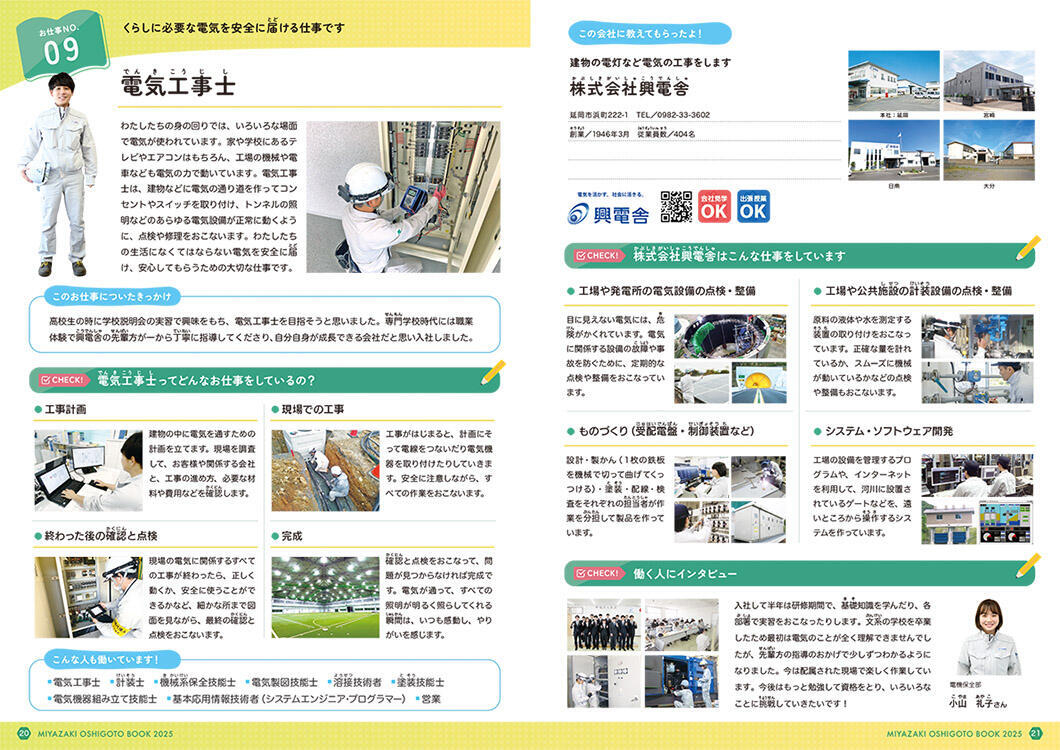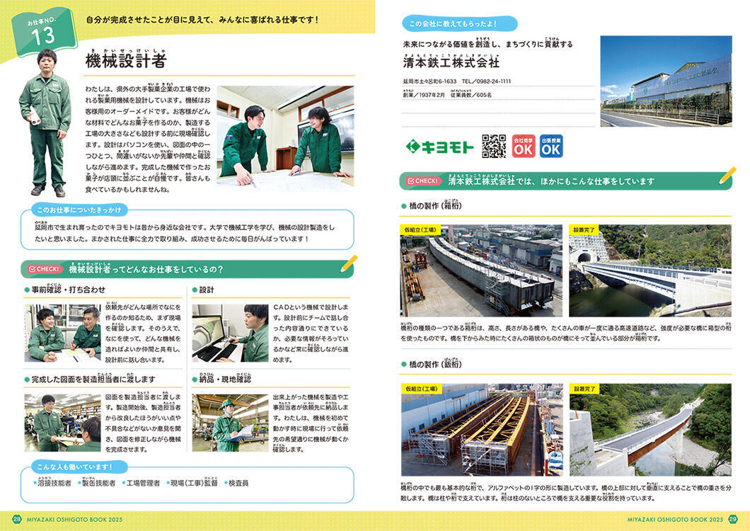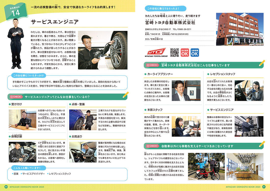 この事業では、地域の未来の担い手である子供たちに向け、県内企業で活躍している様々な業種にクローズアップした「宮崎県のおしごと本」を小学5年生の副教本として配布しています。