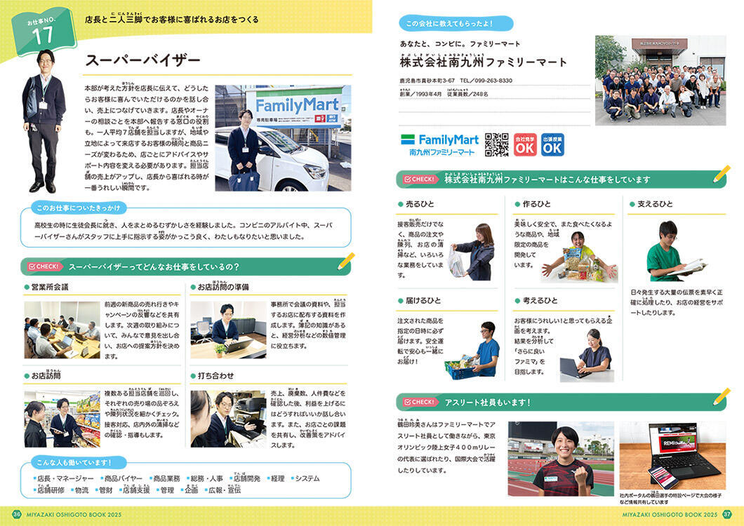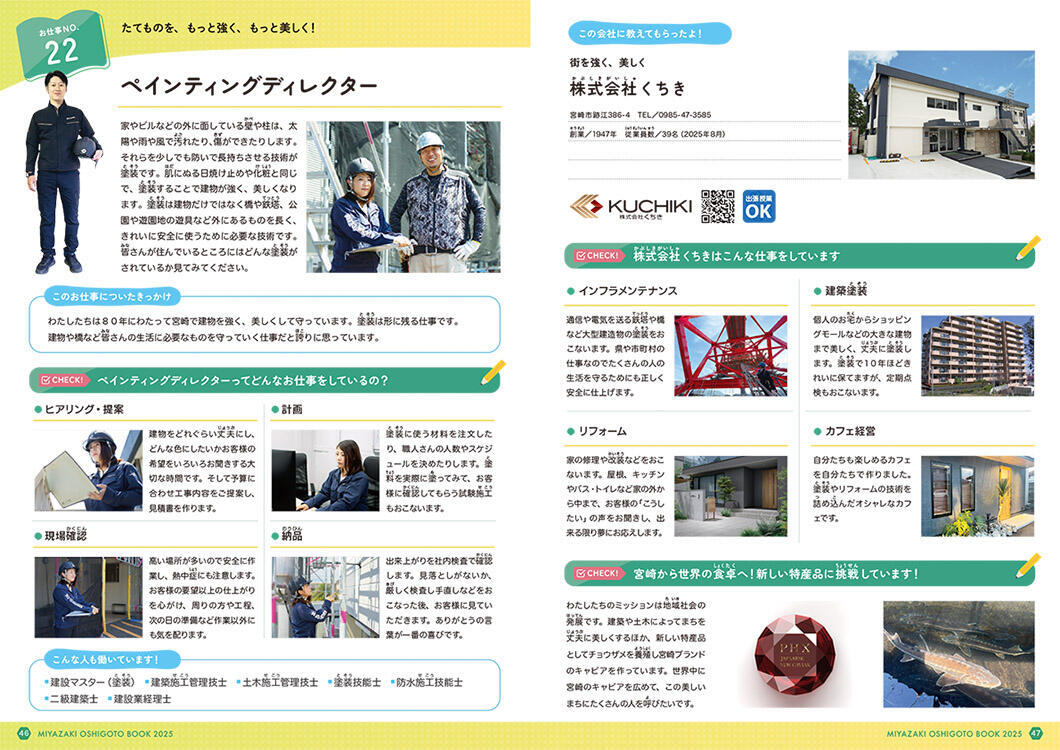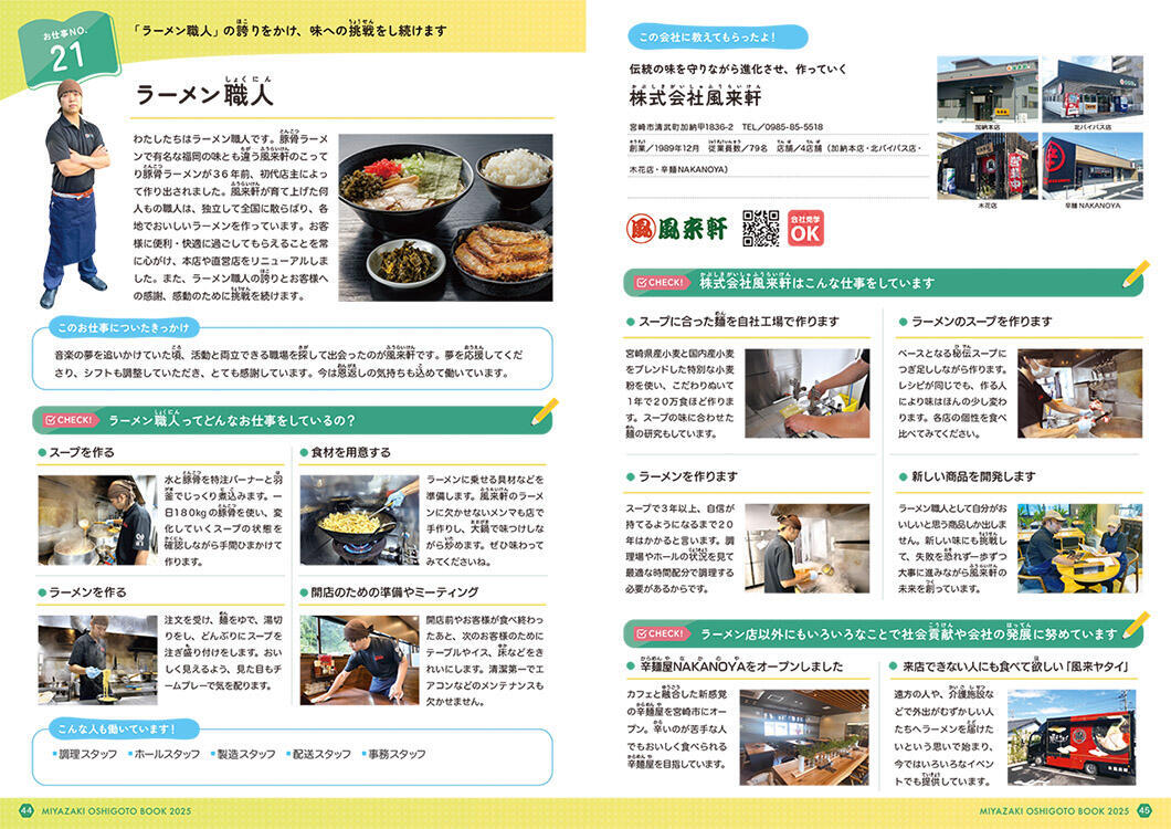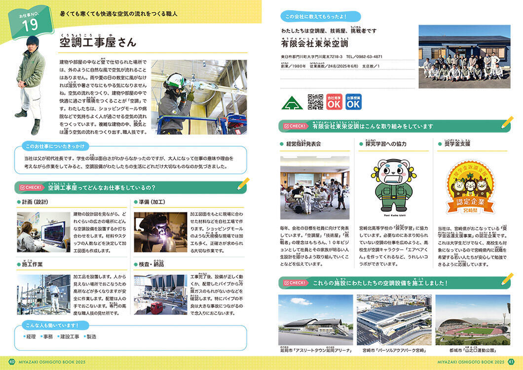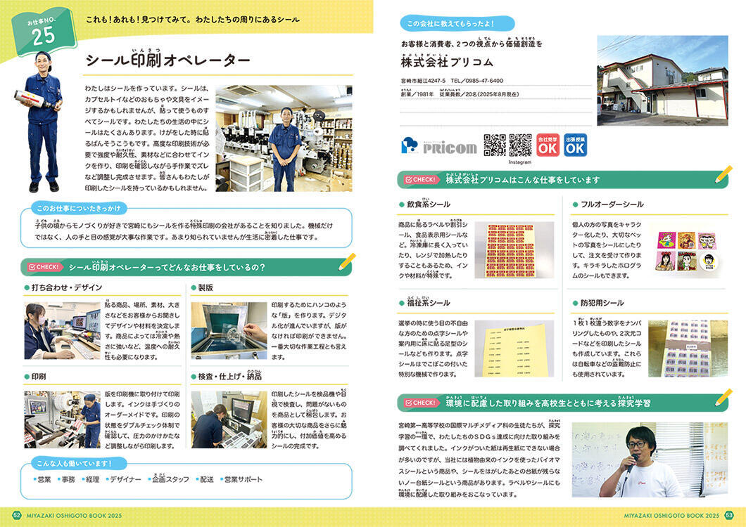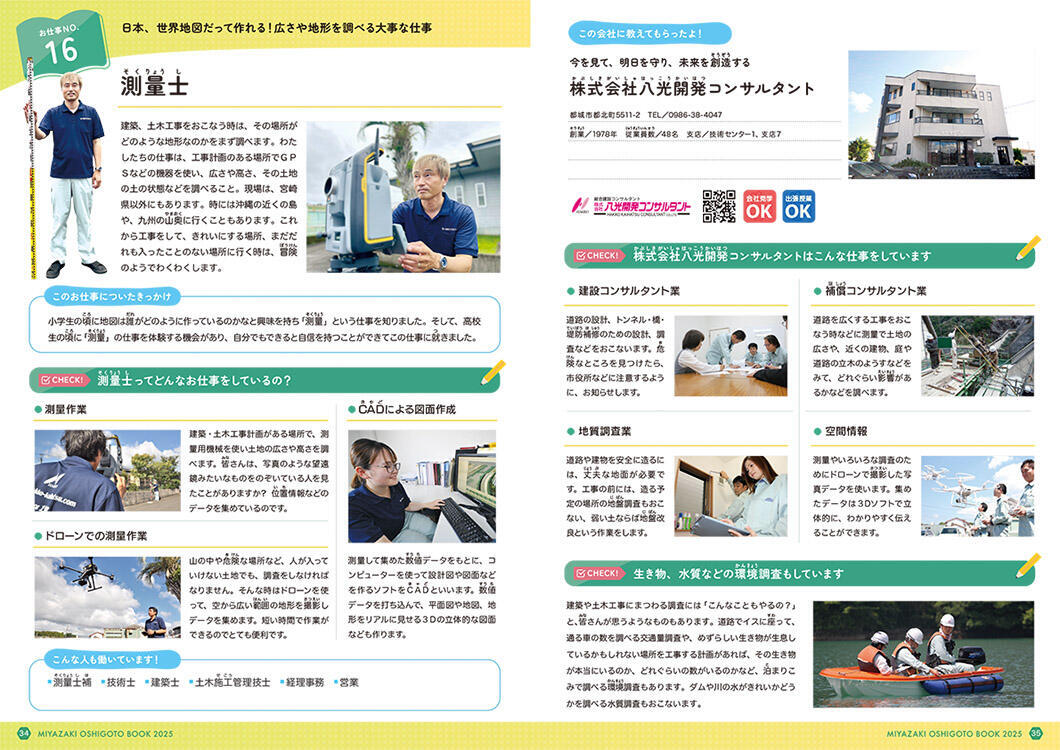 この事業では、地域の未来の担い手である子供たちに向け、県内企業で活躍している様々な業種にクローズアップした「宮崎県のおしごと本」を小学5年生の副教本として配布しています。